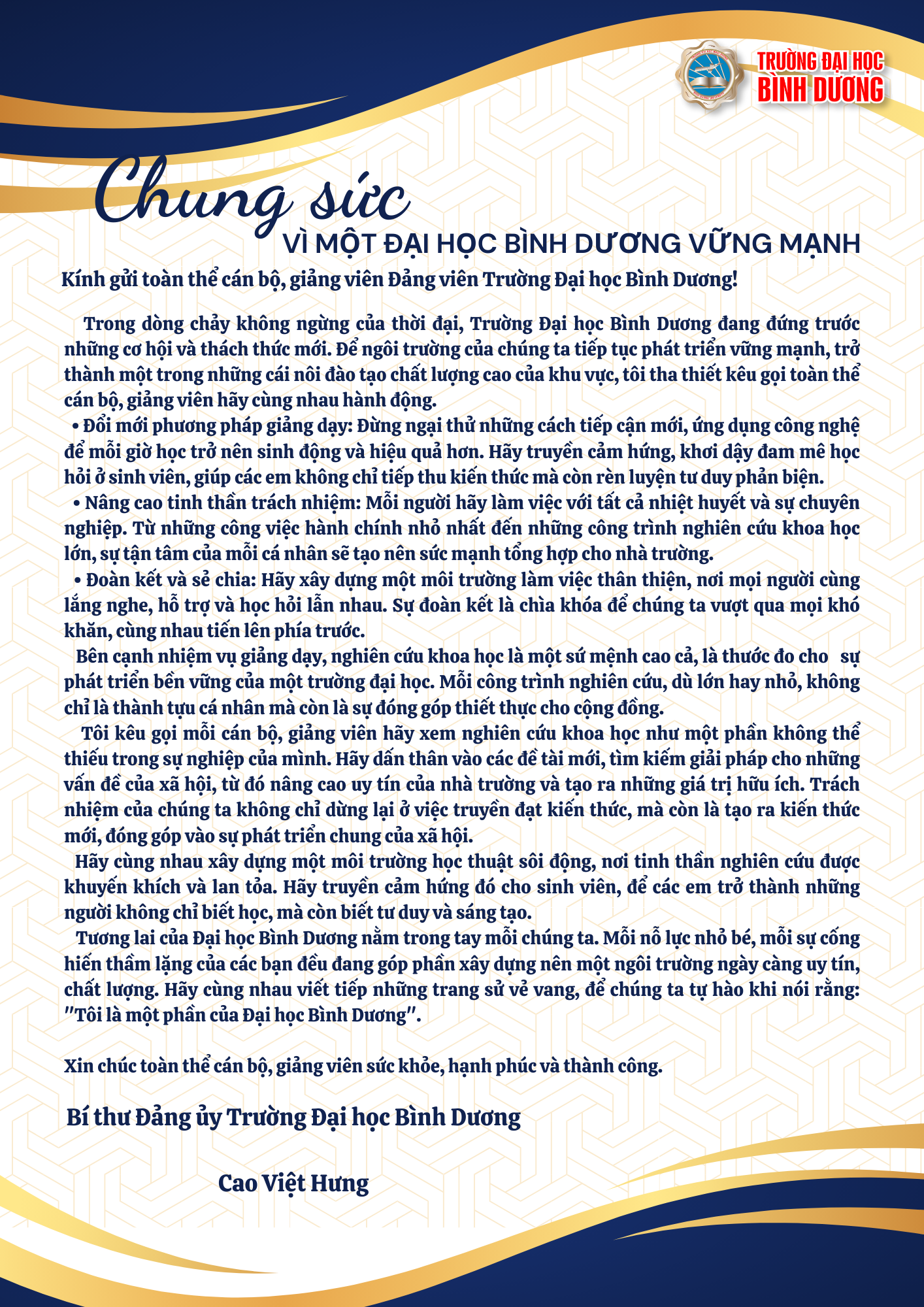 Trong bối cảnh đầy thách thức và cơ hội của thời đại hiện nay, chúng ta cần đoàn kết và hành động để xây dựng một Trường Đại học Bình Dương vững mạnh hơn bao giờ hết. Việc đổi mới phương pháp giảng dạy, nâng cao tinh thần trách nhiệm và khuyến khích nghiên cứu khoa học sẽ không chỉ nâng cao chất lượng đào tạo mà còn tạo ra những giá trị bền vững cho xã hội.Dưới đây là lời kêu gọi từ Bí thư Đảng ủy Trường Đại học Bình Dương, Cao Việt Hưng. Hãy cùng hưởng ứng và tham gia vào sự nghiệp phát triển của ngôi trường chúng ta yêu quý!